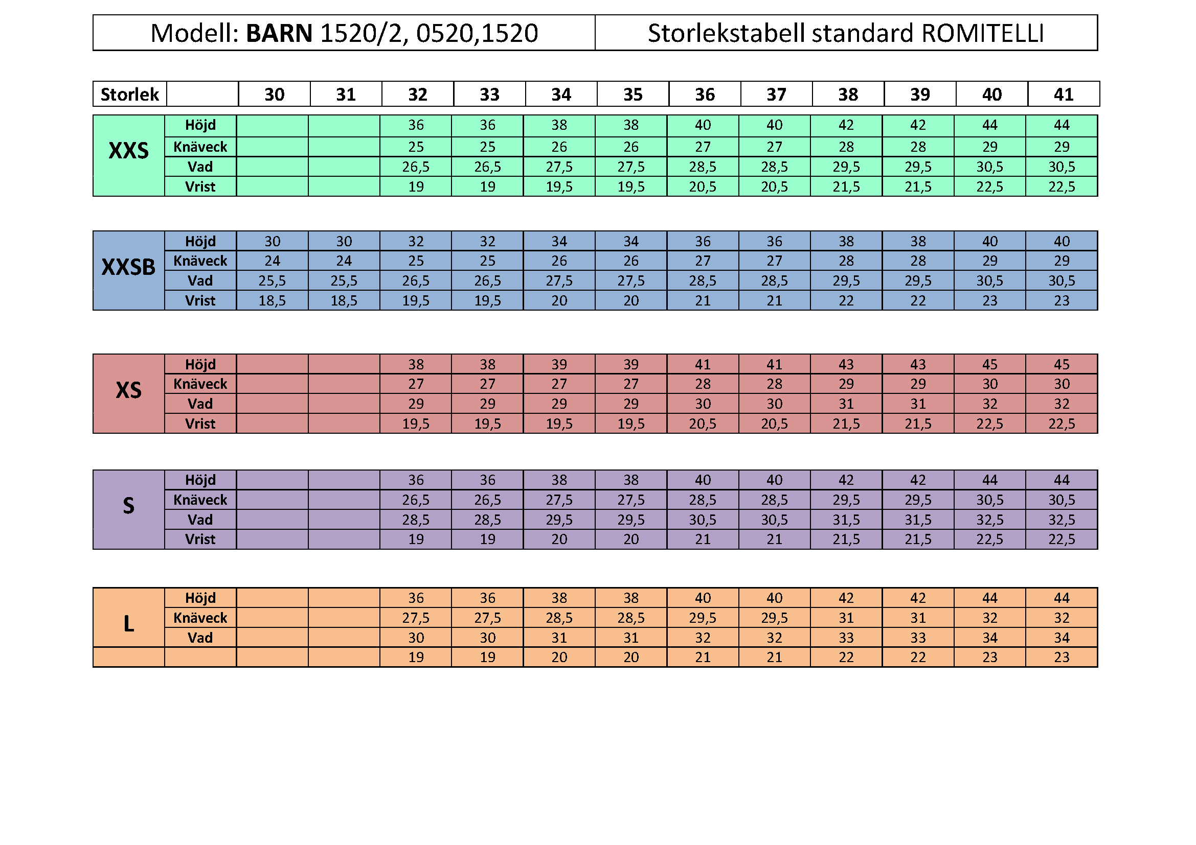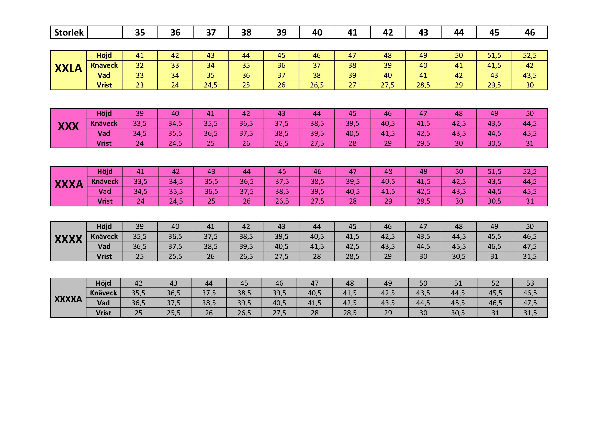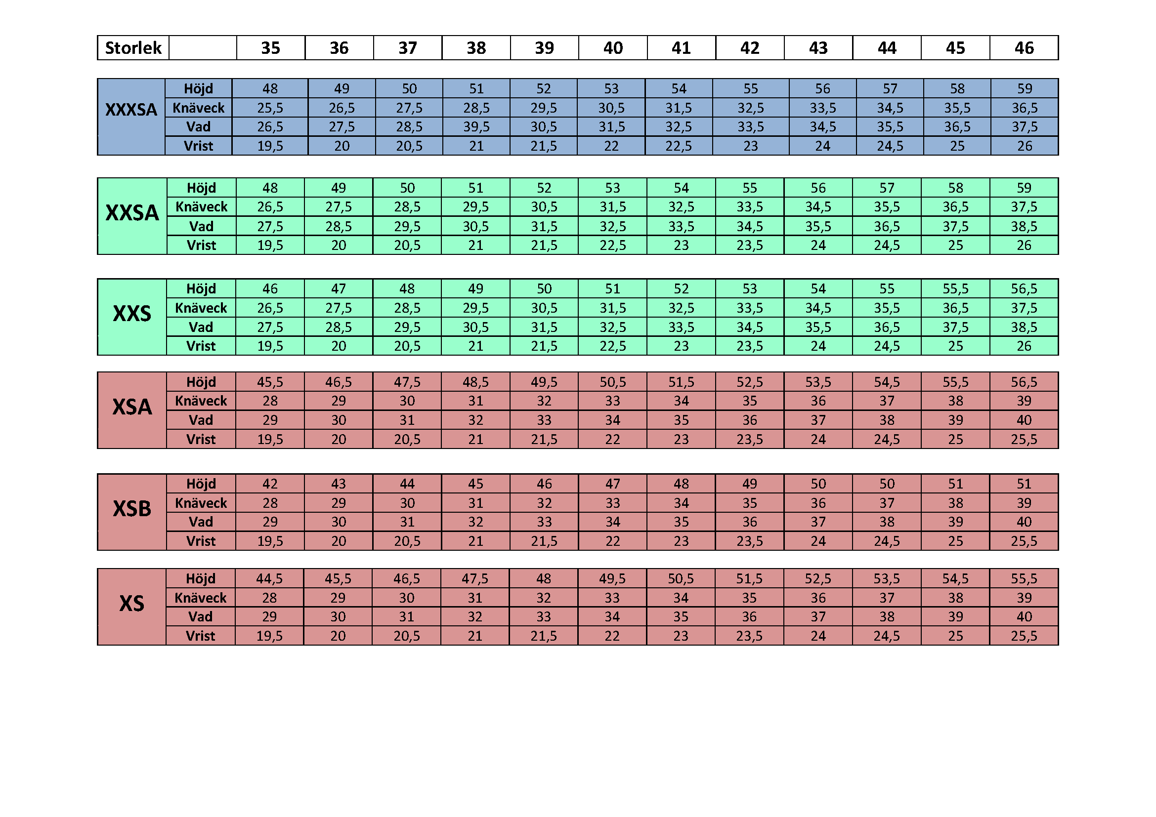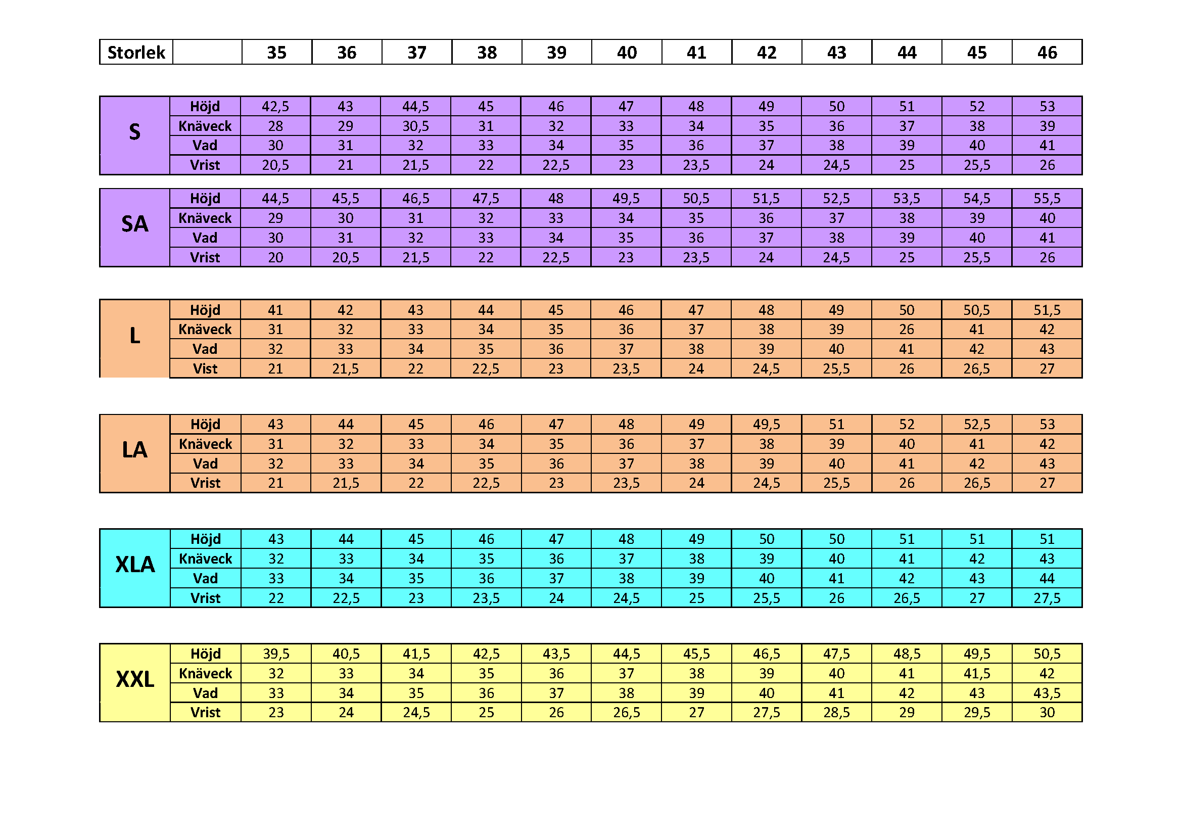 Börja med att följa din storlek i foten, läs av tills du hittar din omkrets runt vaden. Se så att dom andra måtten stämmer och då har du hittat rätt storlek. Är det något mått som inte stämmer, kontakta då oss för råd.