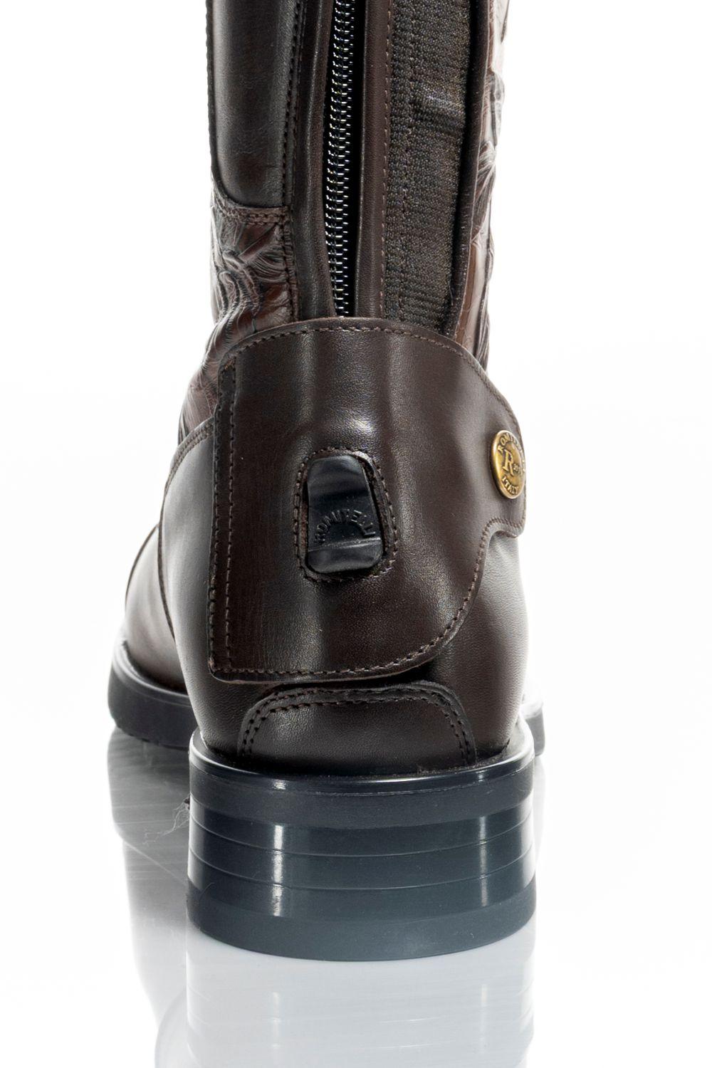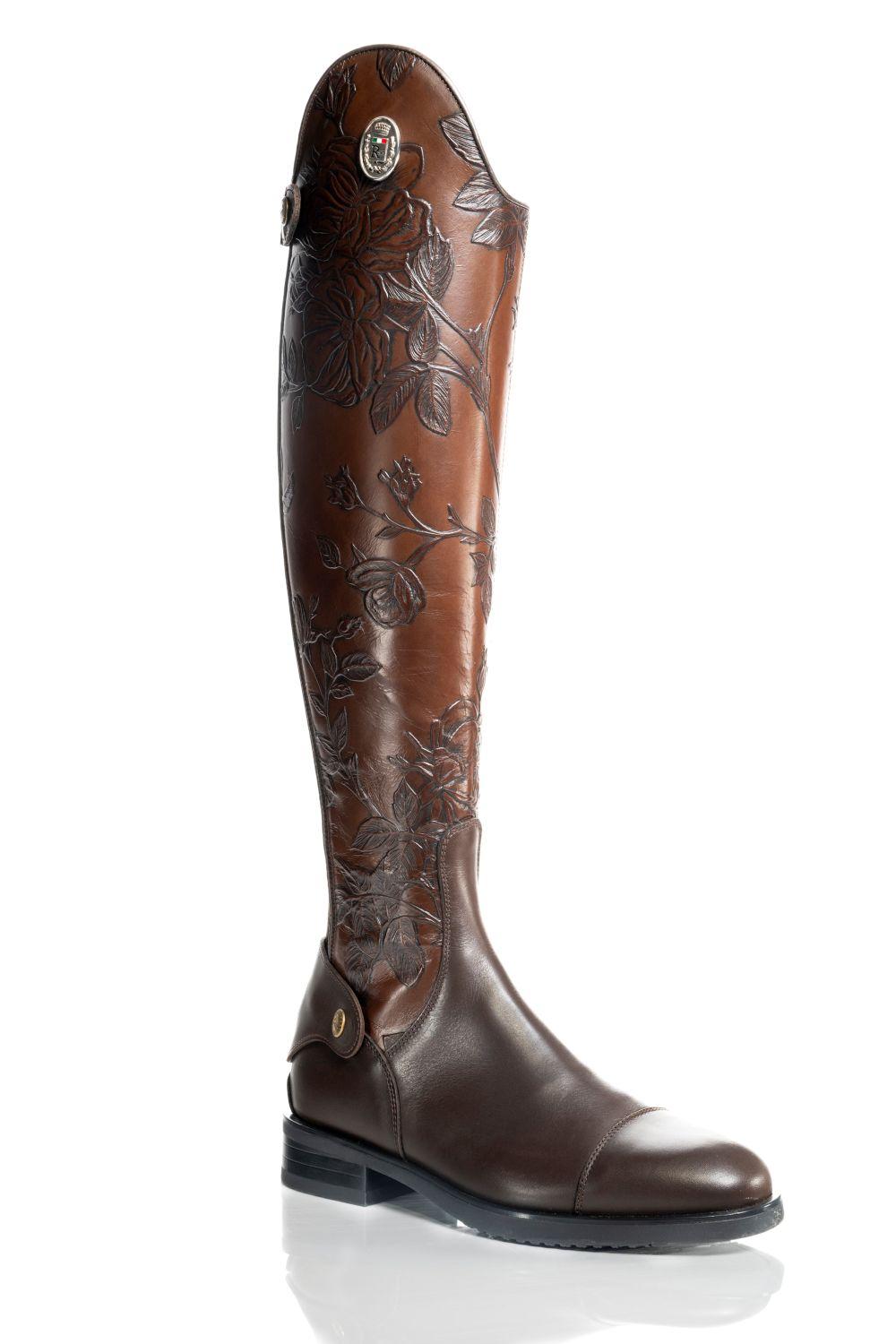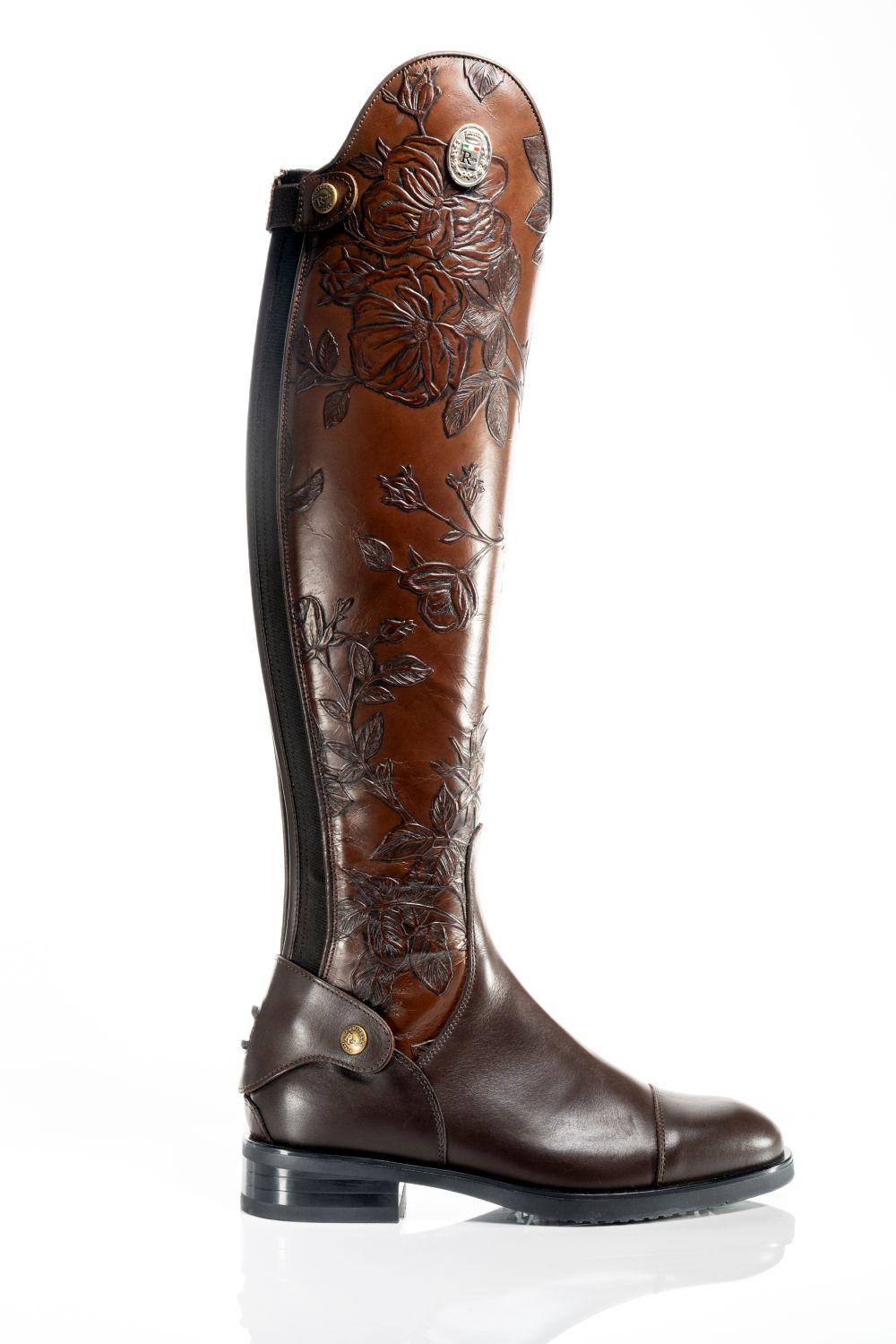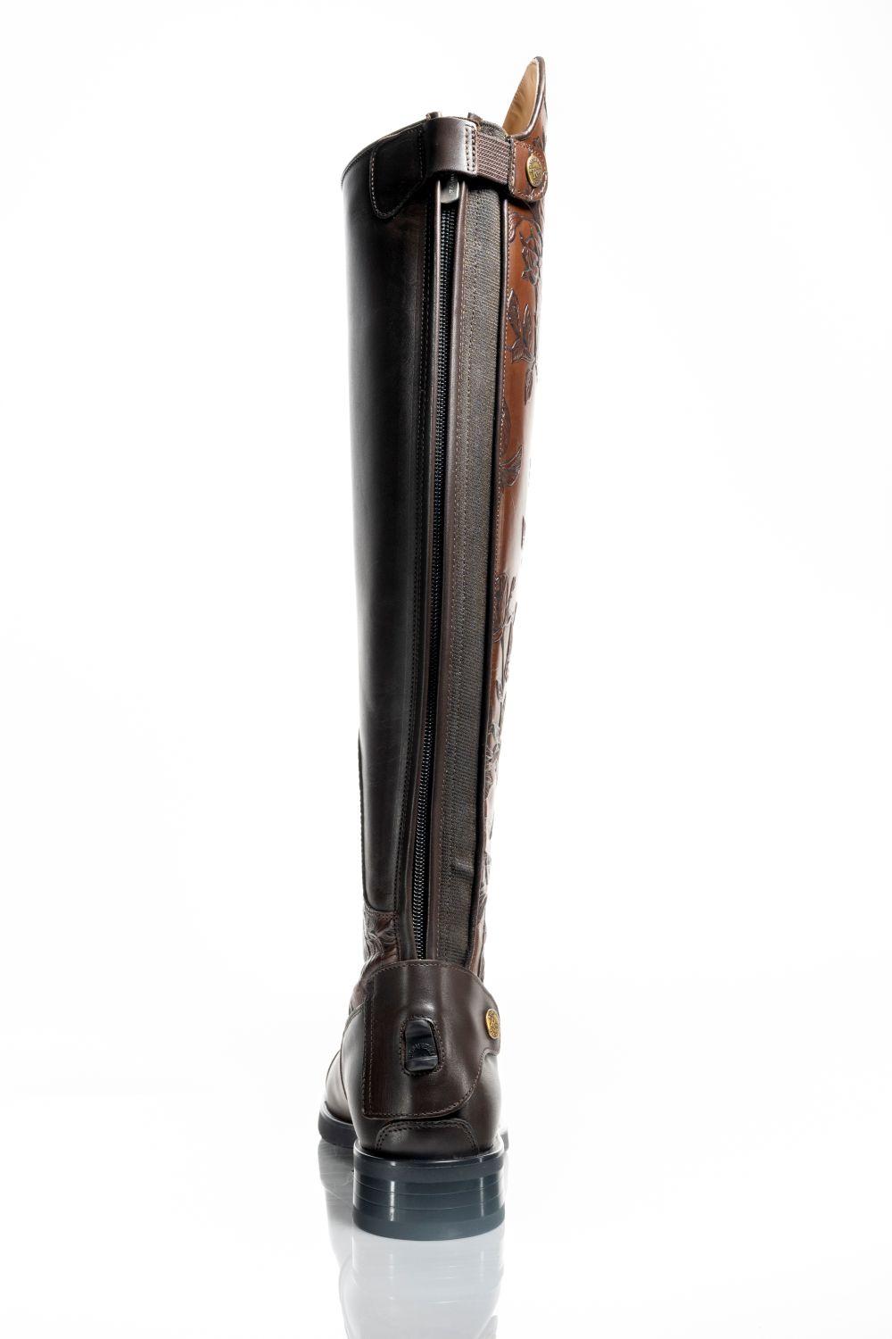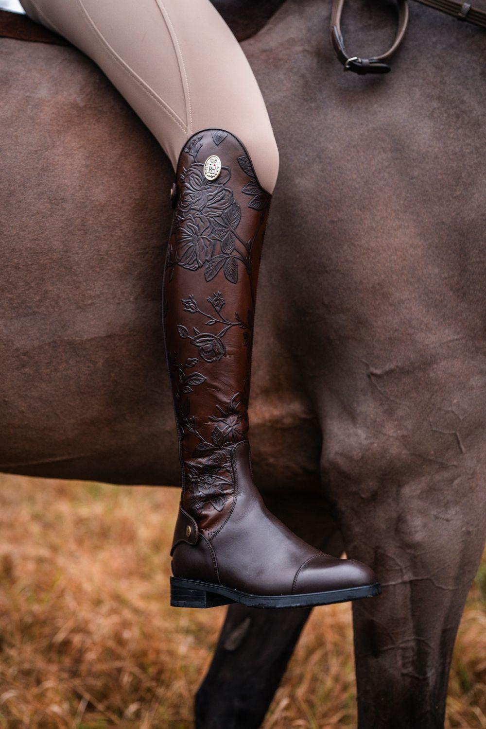 Ridstövel i brunt kalvskinn med mönstrat blommigt läder på skaft. Denna modell liknar vår dressage close contact men utan den gårda utsidan. Denna passar därför till både hoppning och dressyr.