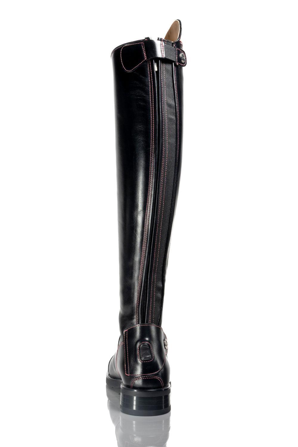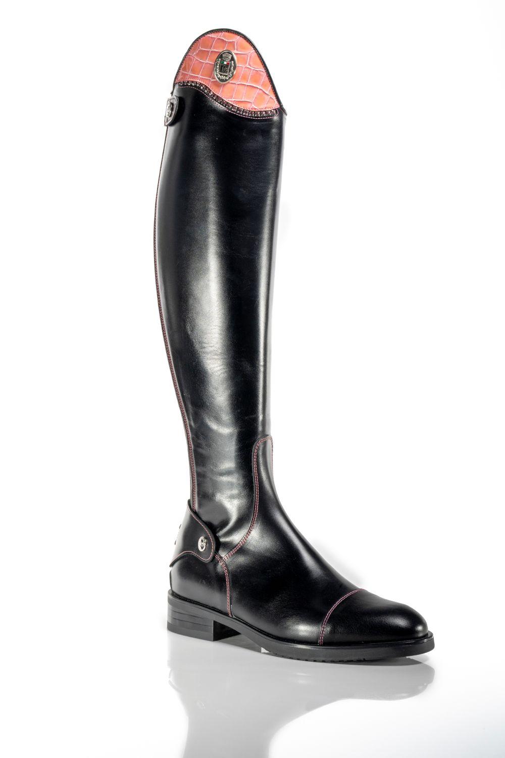 Ridstövel i svart kalvskinn med rosa krokodil mönstrad kalskinn och rose/rosa Swarovski uppe på skaftet.